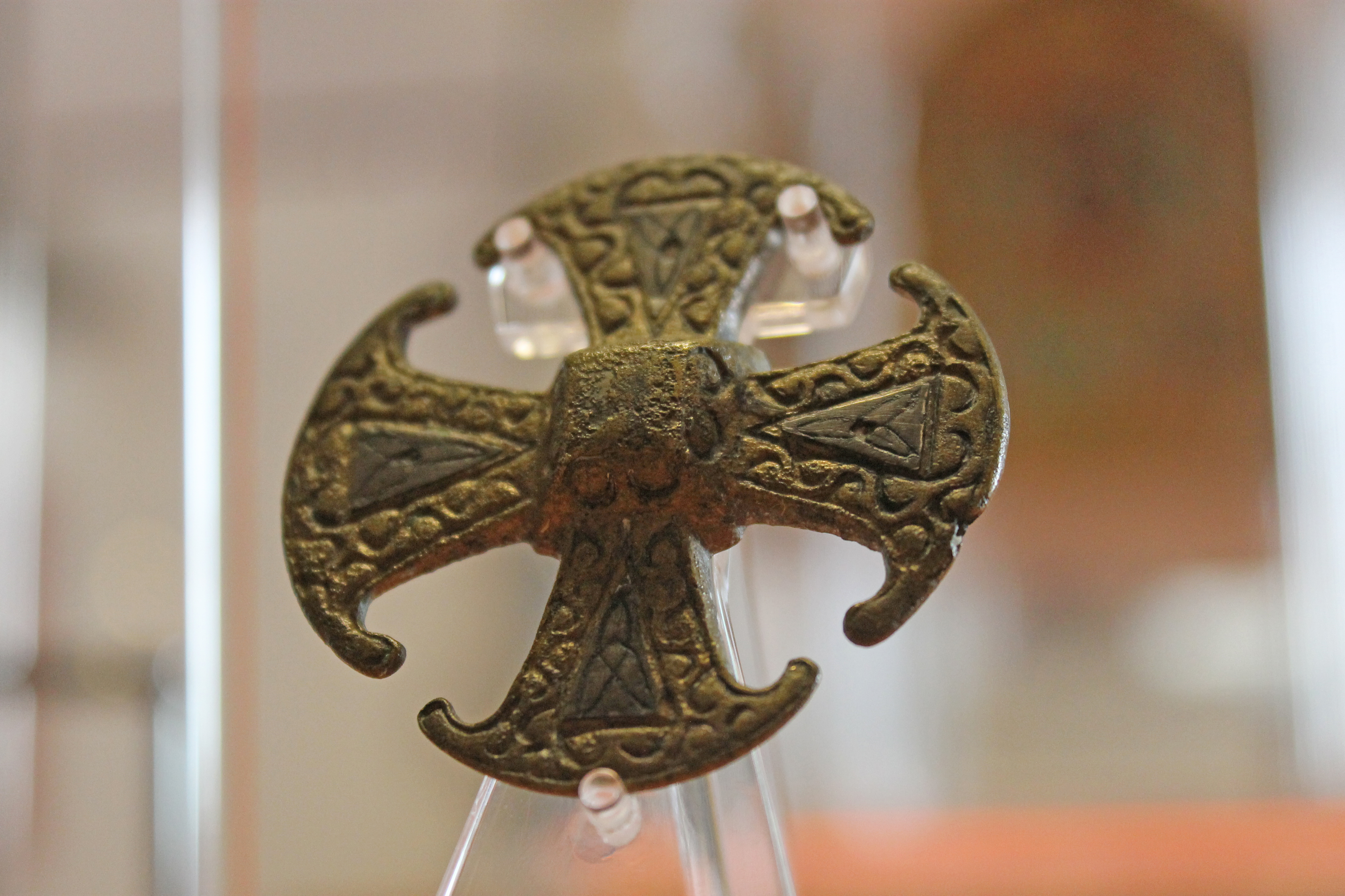 "The Canterbury Cross is unique. The name of it comes from a bronze piece of Saxon jewellery found near St. George's church in 1867... Although it's less than three inches across, it's finely detailed with a triquetra pattern - a three-cornered knot. Symbolising the Christian Trinity, on each of its four curved arms."